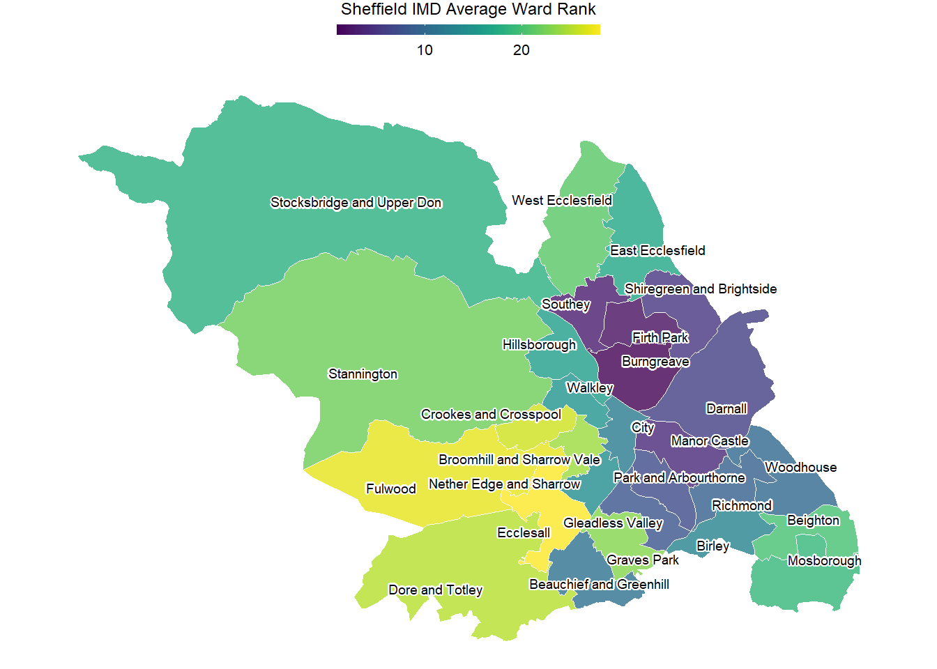 IMD (Indices of Multiple Deprivation) statistics are produced at the LSOA (Lower Super Output Area) level. Sheffield has 345 LSOAs and 28 wards.